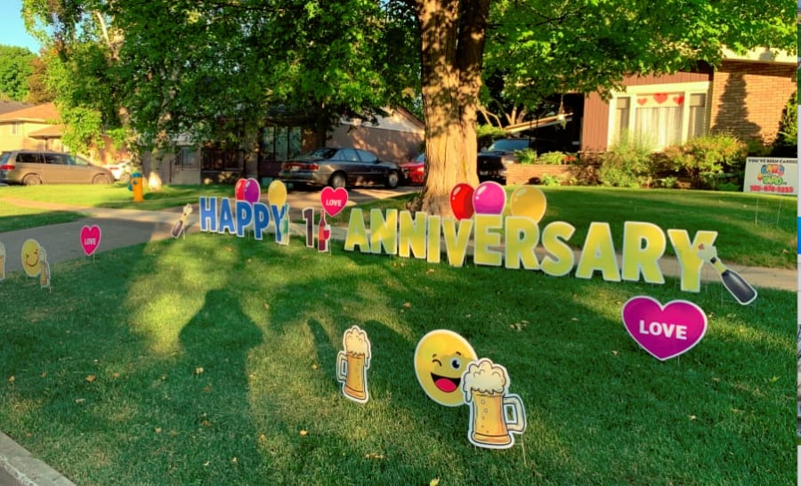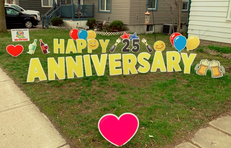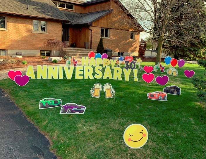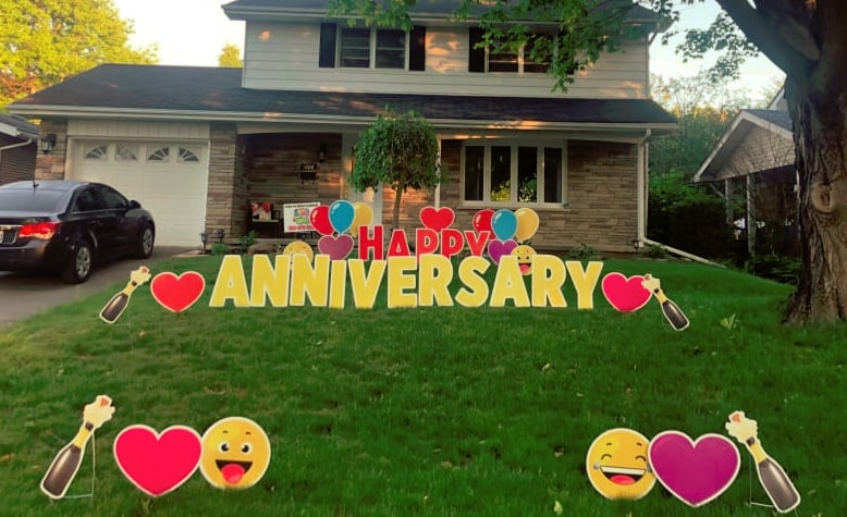 Rental Package Includes the 2' foot tall letters, that spell "HAPPY ANNIVERSARY", with Balloon Signs, *plus an assortment of Emojis and Theme Signs, for up to 10 hours.