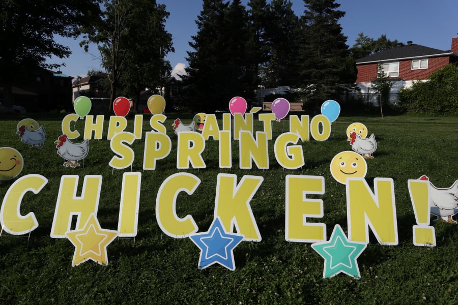 Rental Package Includes the 2' foot tall letters, that spell "JOHN AIN'T NO SPRING CHICKEN !" (and # of years if desired), with Balloon Signs, *plus an assortment of Emojis for up to 24 hours.