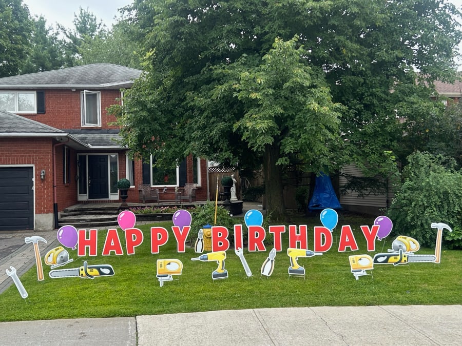 Rental Package Includes the 2' foot tall letters, that spell "HAPPY BIRTHDAY JOHN !" (and # of years if desired), with Balloon Signs, *plus an assortment of Emojis for up to 24 hours.