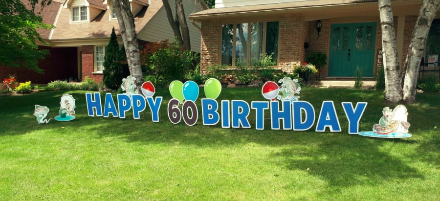 Rental Package Includes the 2' foot tall letters, that spell "Happy Birthday", with Balloon Signs, *plus an assortment of Emojis and Fishing Theme Signs, for up to 10 hours.